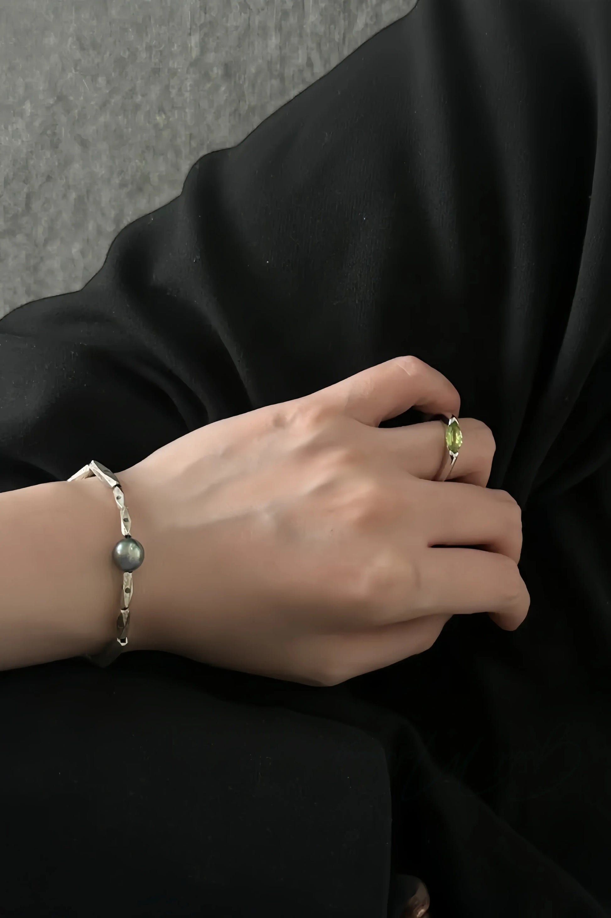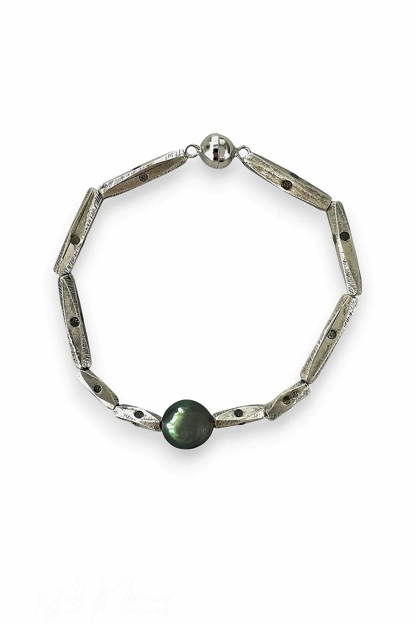 A stunning Tahitian pearl, with deep green hues reminiscent of ocean depths, shines in this elegant silver bracelet. The vintage-inspired segmented design adds a unique charm, while the pearl radiates vitality and energy. Its timeless beauty evokes boldness and grace, a perfect reminder of your vibrant spirit.